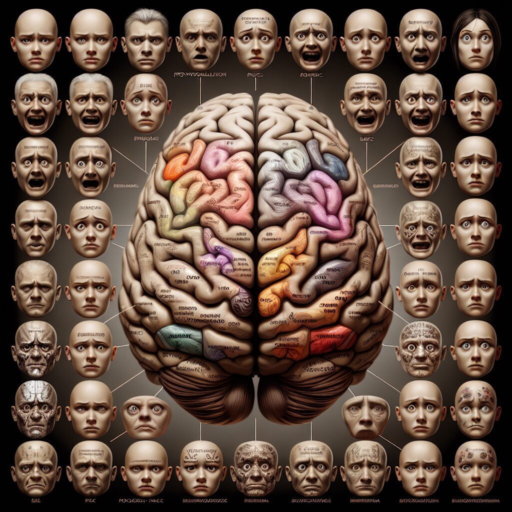یک تصویر از مغز انسان با مناطق مشخص شده برای پردازش احساسات در پس زمینه ای از چهره های مختلف با احساسات مختلف.