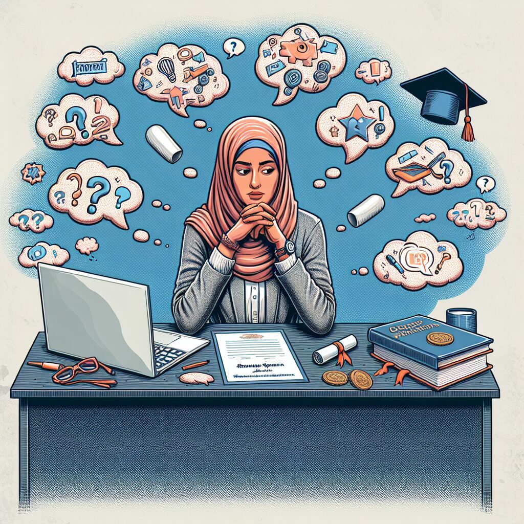 تصویری از فردی در حال تفکر عمیق با نمادهایی از احساسات گیجی و استرس، مانند علامت‌های سوال و ابرهای فکری.