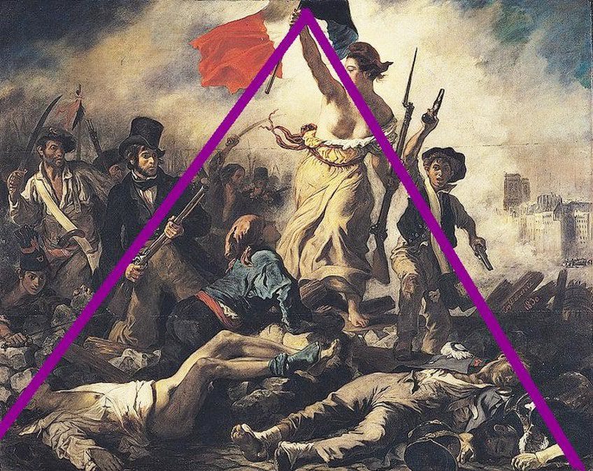 در تابلوی “آزادی هدایتگر مردم” اثر یوجین دلاکروا، ترکیببندی به گونهای طراحی شده که نگاه بیننده را به سمت مرکز و شخصیت اصلی نقاشی هدایت میکند. آزادی، زنی با پستانهای برهنه و کلاه فریژی، به عنوان نمادی از الهه آزادی در مرکز قرار دارد و جمعیتی از مردم را به سوی جلو و بر روی موانع و اجساد هدایت میکند.